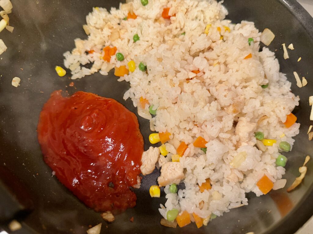 たんぱく質もしっかり摂れるボリュームのあるケチャップライスに仕上がります。