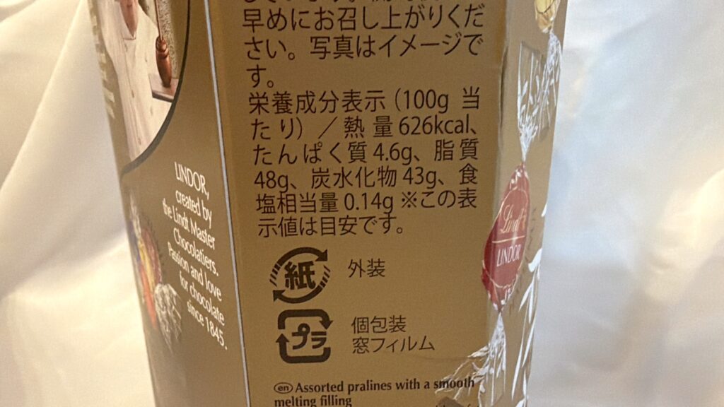 パッケージの表示によると、100gあたりのカロリーは626kcal。
