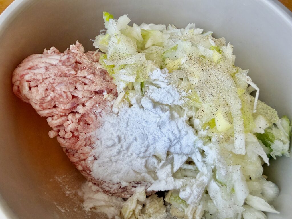ボウルに豚ひき肉、長ねぎ、生姜、醤油、えのき、ごま油、塩こしょう、片栗粉を入れ、粘りが出るまでしっかり混ぜます。