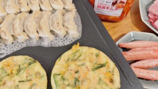 コストコ食材で作る簡単パーティーメニュー。餃子やbibigoチヂミ、キムチなどをホットプレートで焼くだけ。少人数から大人数までおすすめのホームパーティーごはんを紹介します。